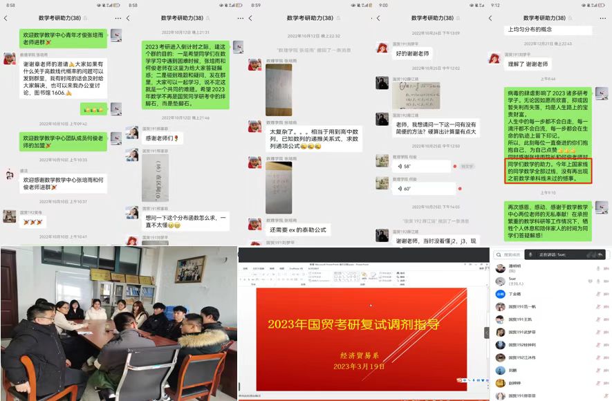 以经济贸易系教师党支部联合数学教学中心教师党支部与国际经济与贸易专业学生党支部签订师生支部共建协议为契机,切实帮助学生解决在考研数学学习中遇到的难题,经贸系教师党支部牵头建立了“数学考研助力”的微信群,以落实共建协议中“提升考研学生数学成绩”的目标。从建群至2023年国家研究生考试开考前夕的将近75天内,除了同学们私下请教老师之外,国贸学子共在群中提问11题,数学教学中心的张培雨老师和何俊老师回复几近20次,两位老师利用中午和深夜休息时间专门答疑解惑,辛苦付出也达到了预期效果。2023年达上国家线的国贸同学数学单科也全部过线,没有再出现之前数学单科线未过的憾事。