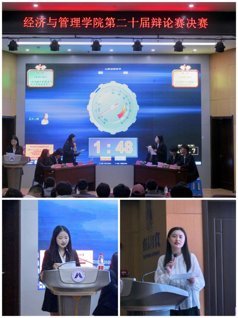 为深入贯彻落实学校“三全六专”育人工作要求,展现当代大学生青春风采,丰富同学们的课余生活,培养同学们的团队精神,锻炼同学们的思维表达能力,经济与管理学院于4月16日下午2点在C座七楼报告厅举行第二十届院杯辩论赛决赛。决赛特邀外国语学院团委负责人张君,数理与金融学院团委负责人程安琪,宣传部网络与文化建设科吴鹏老师,校优秀辩手代表等担任评委。经济与管理学院团委书记赵恒梅、选手亲友团以及学生代表观摩了此次比赛。