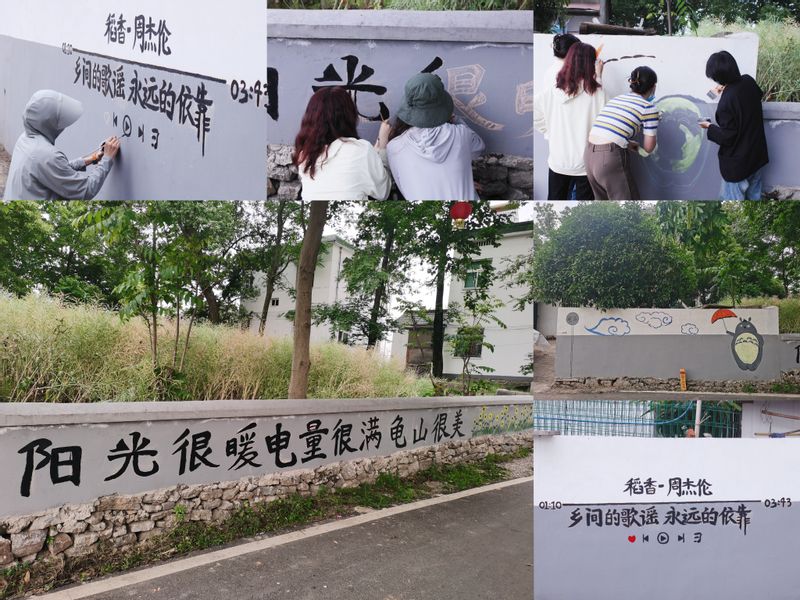 在赵恒梅的指导和村干部的协助下,10多名学生承担起了“乡村彩绘师”的角色,从“文案”“构图”到“素描”再到“上色”,大家分工合作,利用村民房屋的墙体,根据周围环境,结合当下网络热点,创作出“乡间的歌谣”、“龟山站”、“龟山很美”为主题的墙绘作品。