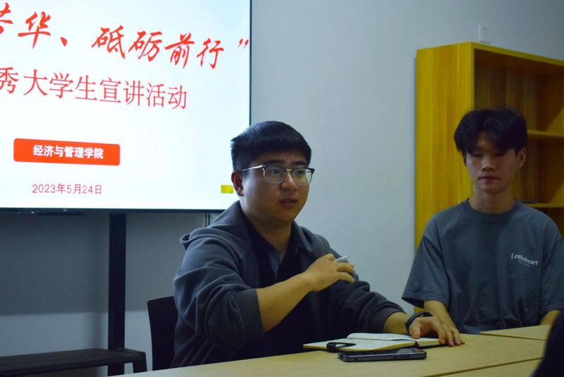 为深入学习宣传贯彻党的二十大精神,落实“我为同学办实事”,促进大学生更好就业,依托学生会服务站开展“权益进宿舍”行动,5月24和25日,经济与管理学院在男22栋125“管家——经济与管理学院社区工作站”开展“不负芳华,砥砺前行”优秀大学生宣讲活动。本次活动邀请了考取选调生的夏磊和考取西南政法大学研究生的张子航同学,面向21、22级部分同学分享考研、考公经验。
