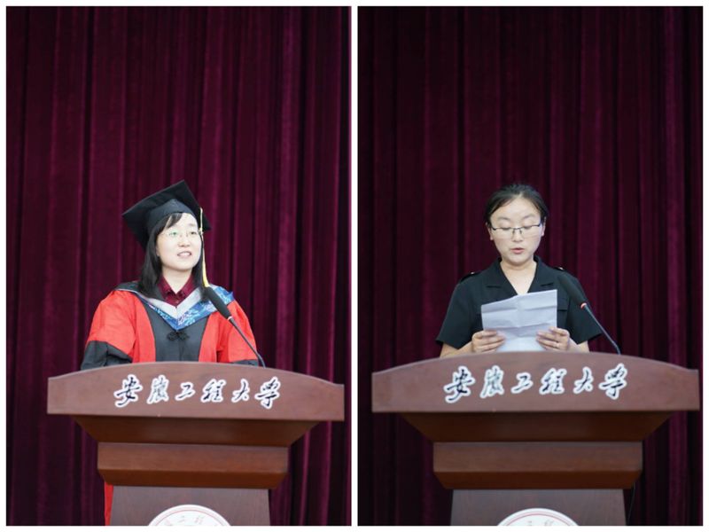 教师代表孙颖深情寄语毕业生,从校园的小课堂到人生的大课堂,要努力学习,终身学习,勇敢扛起时代的责任与担当,做无愧于国家,无愧于时代,做一名安工程经管人。”辅导员代表张方回顾了四年的点点滴滴,并赠言祝愿毕业生同学们星光不负赶路人,时光不负有心人,历经千帆,归来仍是少年。”