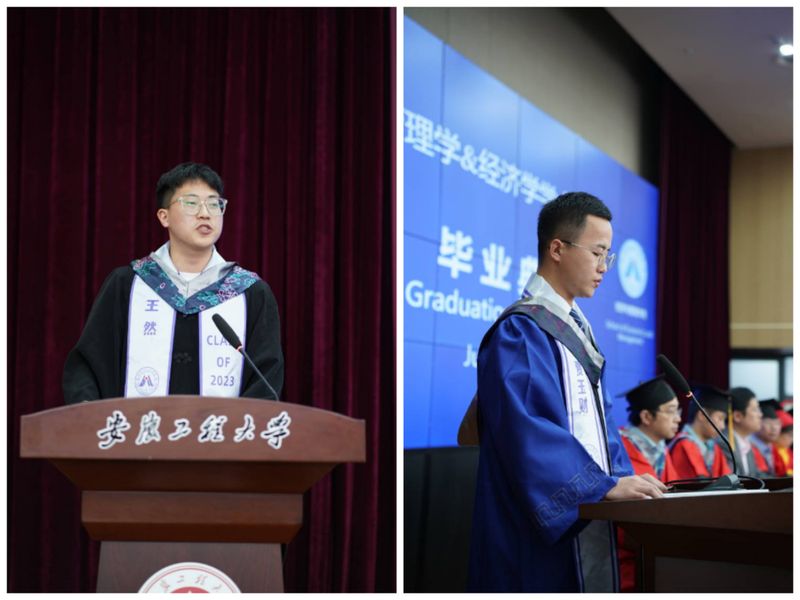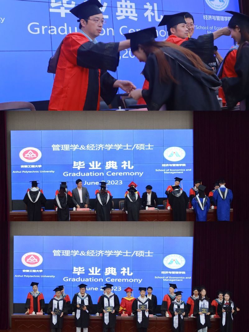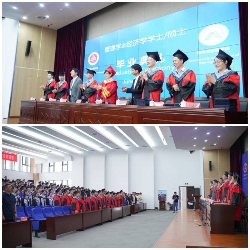 本科生代表王然发言道,四年里我们开阔视野,仰望星空与脚踏实地并存,感谢学院老师们毫无保留的将知识教授给我们,感谢辅导员老师们的辛苦付出和默默守护,祝经济与管理学院桃李满天下!研究生代表贾玉财表示,回首三年光阴,如同一部电影,我们将怀着对母校的留恋,奔赴各地开启自己的新篇章,太阳强烈,祖国温暖,往后余生让我们都成为温暖的人,继续为国家和民族奋斗。