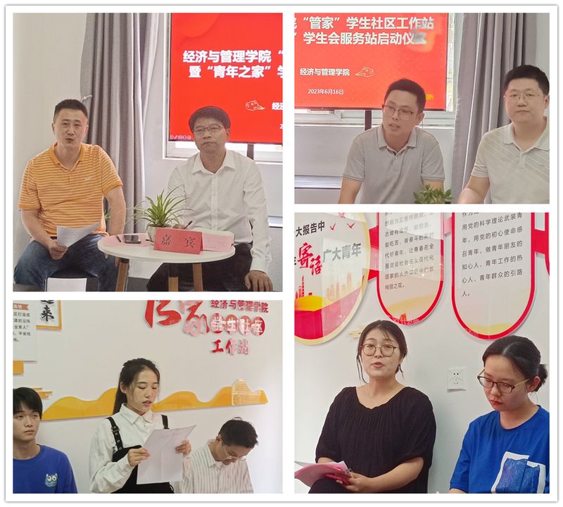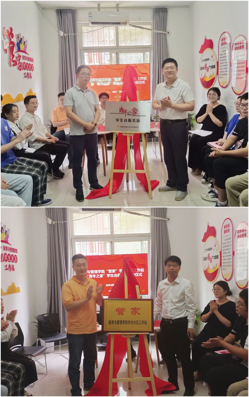 李恒奎和刘海涛为“青年之家”学生会服务站揭牌。水心宝与杜松涛共同为“管家”经济与管理学院学生社区工作站揭牌。