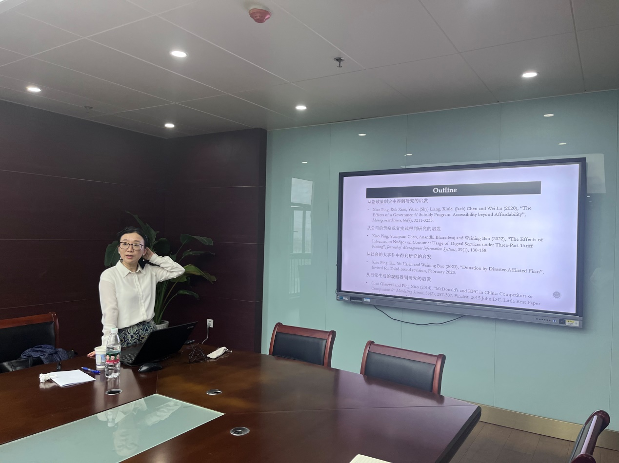 报告会上,Ping Xiao教授结合其发表的国际顶刊论文研究、发表历程,详细讲解了如何从众多商业实践现象中凝练科学研究问题,如何针对研究问题进行研究方法设计,如何提炼出新的理论贡献,如何在期刊的多轮审稿中,进一步吸收评审专家的意见升华文章的理论贡献。讲座中,Ping Xiao教授详细展现了,如何解读审稿专家意见的背后之意,如何积极应对尖锐意见并进行转化,如何进行超越审稿专家预期的回应等。通过本次讲座,Ping Xiao教授向师生深刻展示了高水平科研从起点到最终发表的全过程。报告最后环节,Ping Xiao教授与师生进行了热烈的问答互动。