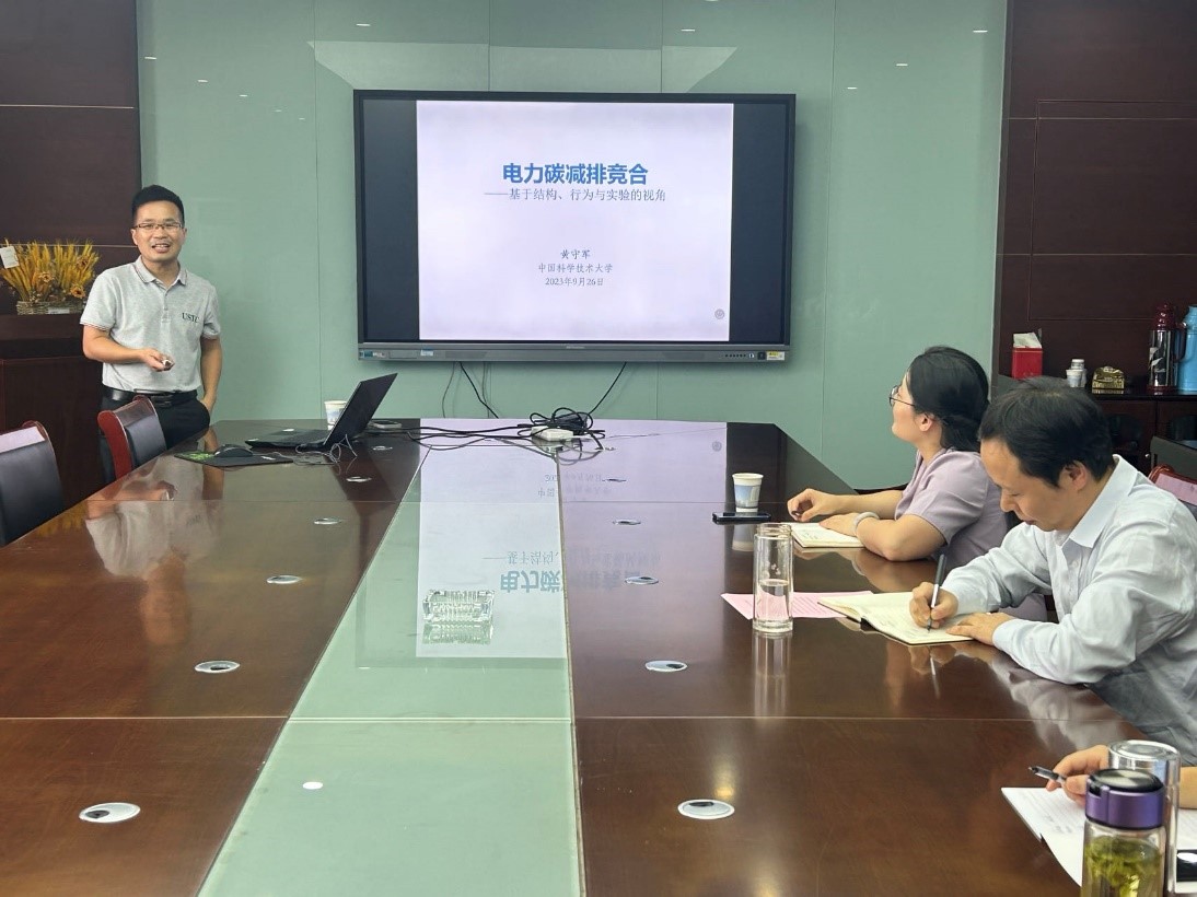 9月26日下午,应科技处、研究生部和经济与管理学院邀请,中国科学技术大学黄守军副教授为广大师生开展了举办了以“电力碳减排竞合——基于结构、行为与实验的视角”为主题的学术报告。报告会由经济与管理学院副院长蔡书凯主持,学院部分教师和研究生参加了本次报告会。