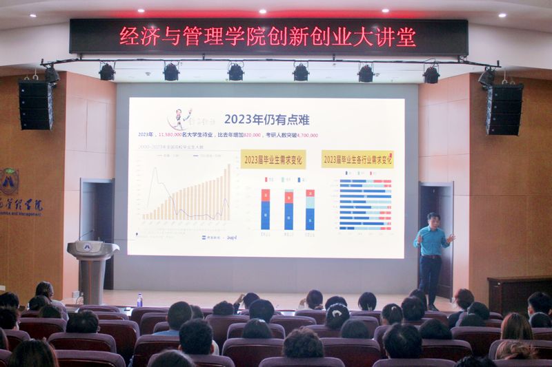 吴锋从分析一段毕业生就业的短视频引出“赢得未来,做一无二的自己”的中心主题。他以2022年和2023年的就业数据状况进行了细致解析,明确指出后疫情时代下毕业生将面临的危机、挑战和就业困难的原因。接着,以近几年热门专业薪资上涨,毕业生人数增多等现象向到场学生提出“我们离梦想有多远”的问题,启发同学们思考。围绕这一问题进一步展开,通过详实的社会数据分析,吴锋阐述了“我能做什么远比我想做什么”这一观点的重要作用。随后,他从“重新认识自己、认知职业、认识职场、职业生涯规划设计和自我实现”这五个板块,不断引导学生进行自我认知意识的增强,以及职业认知、职业目标的确认,推进学生在校期间要有更清晰的职业发展规划。报告结束前,他勉励青年大学生只有努力思考,坚持不懈,不断积累,在积累中逐渐完善,最终才能助推自己发生改变。讲座现场,吴锋语言风趣幽默、生动活泼,非常接地气,经济学理论深入浅出,现场互动气氛热烈,令在场师生受益匪浅。