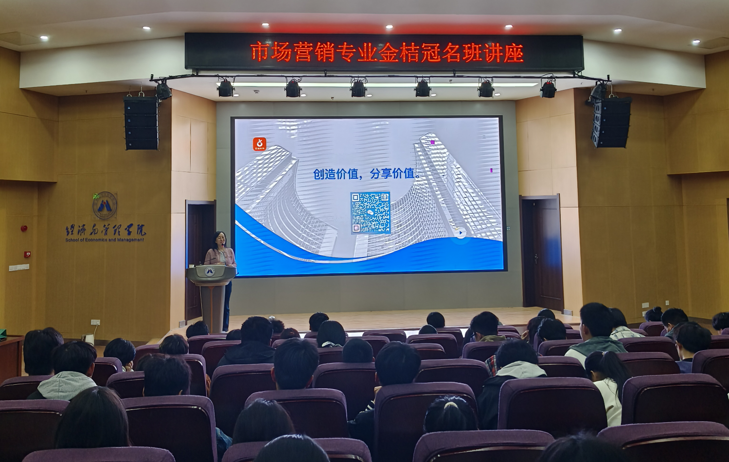 马民丰在讲座中,从品牌发展历程、经营团队、商业模式、营收规模等方面介绍了金桔科技有限公司的主营业务与旗下品牌,并结合公司业务与个人职业生涯,与同学们分享了对市场营销的行业理解与学习心得,启发同学们思考专业定位与个人规划,并鼓励同学们珍惜时间、充实自己,为未来的人生做好铺垫,为将来的发展打好基础。