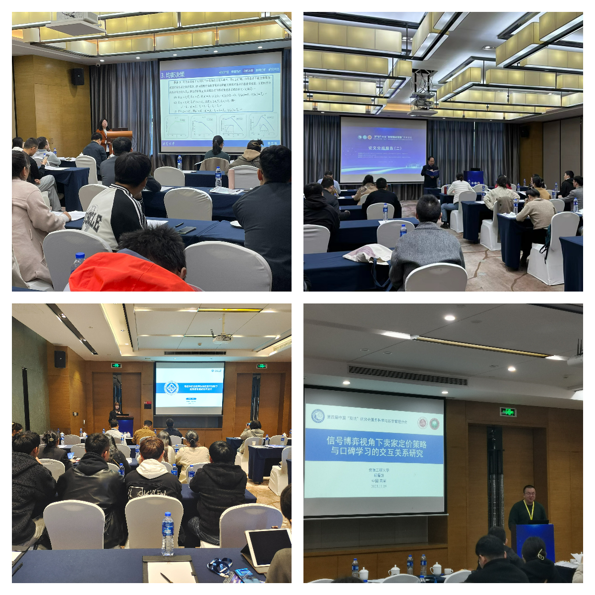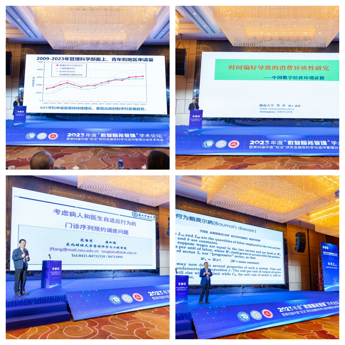 在主体报告阶段,国家自然科学基金委管理学部一处处长霍红研究员、湖南大学工商管理学院陈收教授、东北财经大学管理科学与工程学院唐加福教授、中国科学院数学与系统科学研究院杨晓光研究员分别以《从G01学科资助形势看自然科学基金人才资助体系》、《时间偏好导致的消费异质性研究—中国数字经济环境及证据》、《考虑病人和医生自适应行为的门诊序列预约调度问题》、《鲍莫尔病与数智服务》为题做了精彩的主体报告。上海交通大学曾赛星教授、中国科学院大学李建平教授、同济大学张小宁教授分别主持了主体报告。