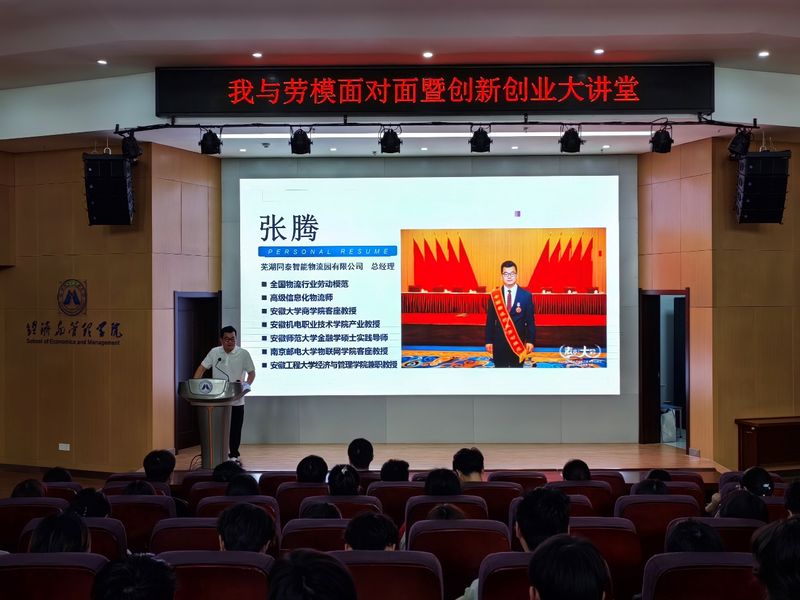 为进一步加强大学生创新创业能力、弘扬劳模精神,4月24日,经济与管理学院邀请“全国物流行业模范”、芜湖同泰智能物流园有限公司总经理张腾,在C座7楼报告厅举办“我与劳模面对面暨创新创业大讲堂”活动。物流管理、工商管理、国际经济与贸易、人力资源等专业负责人,近200名学生聆听了报告。报告会由学院党委副书记刘海涛主持。