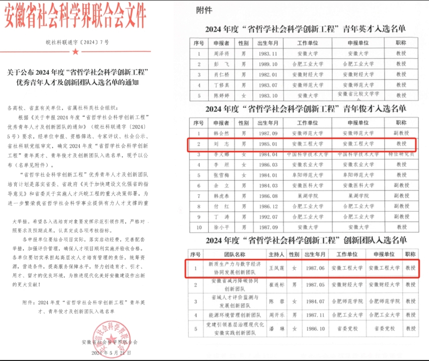 近日,安徽省社会科学界联合会公布了2024年度“省哲学社会科学创新工程”优秀青年人才及创新团队名单,经济与管理学院王凤莲教授和刘志教授分别荣获创新团队项目和青年俊才项目。