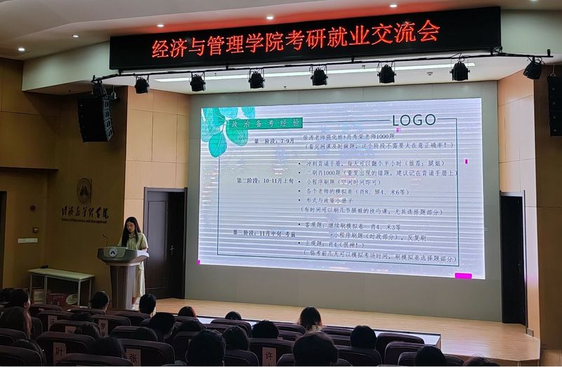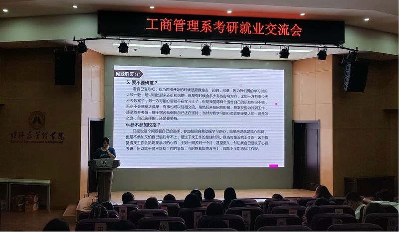 首先,在考研方面,5名考取研究生的同学从不同角度介绍自己考研经验,具体分享了考研的目标选择、学习方法、时间安排、备考心态等。来自人力专业202班汪晓红向大家介绍了自己各科的学习方法,分享了要不要研友、如何坚持到底等经验。人力专业201班王佳慧分享了自己各个时间线的学习安排,强调了考研期间心态调整的重要性,为大家分享了自己疏解压力的方法。工商专业201班王永荣分享了自己择校历程,为大家提供择校方法。