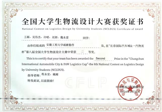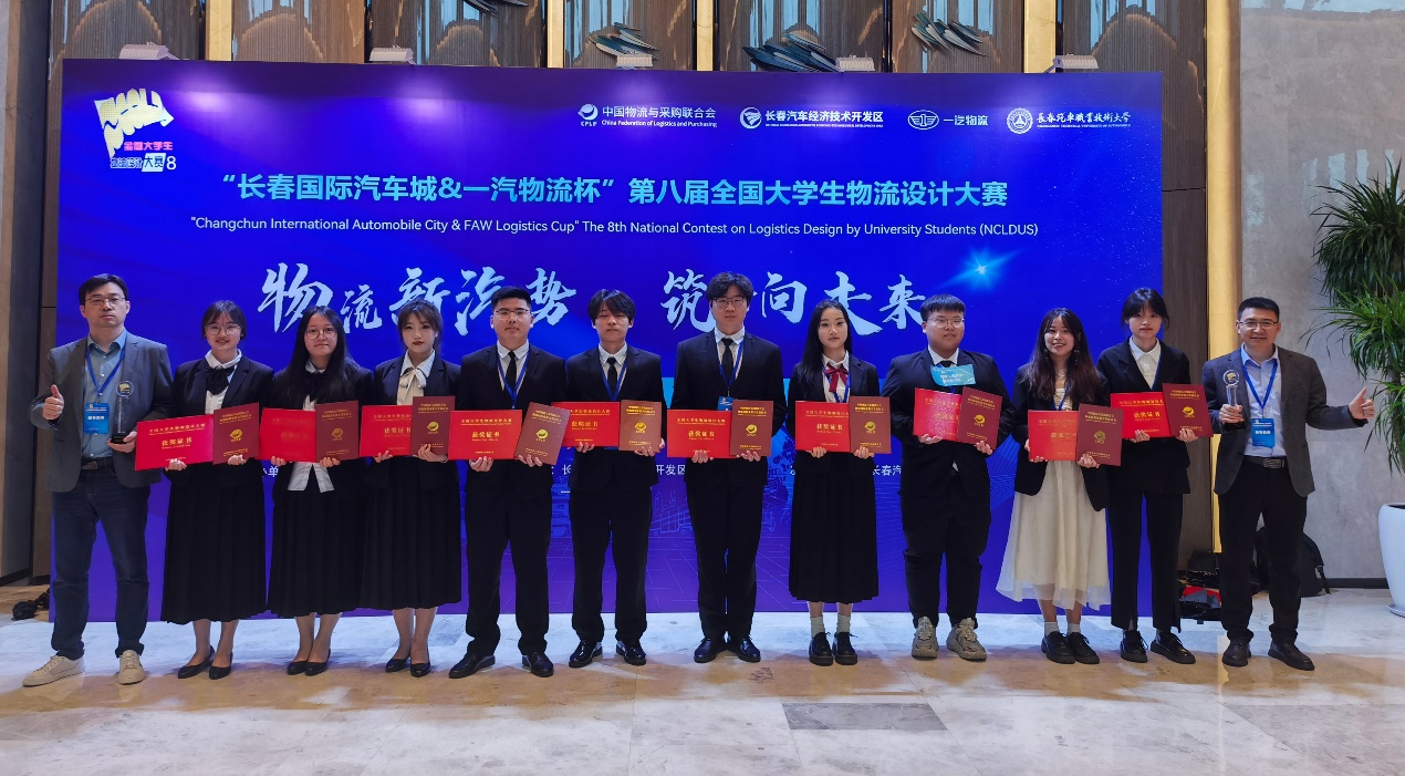 5月23日至26日,由中国物流与采购联合会主办的“长春国际汽车城&一汽物流杯”第八届全国大学生物流设计大赛决赛在长春举行。我校经济与管理学院物流科学系教师程永宏、姚刚指导的“雨耕勤作队”(参赛队员:王硕、许晴、吴伟杰、魏永雷、刘妍)和张云丰、朱康丽指导的“神山口强盛集团队”(参赛队员:程畅、许佳雪、李梦颖、陆逸洋、杨永博)双双荣获全国二等奖,10位参赛学生取得中级物流师证书。这是继第五、六、七届全国大学生物流设计大赛分别获得1项全国三等奖、1项全国二等奖、2项全国三等奖后,本次赛事再次获得2项全国二等奖,创下我校参加该赛事以来的历史最好成绩。