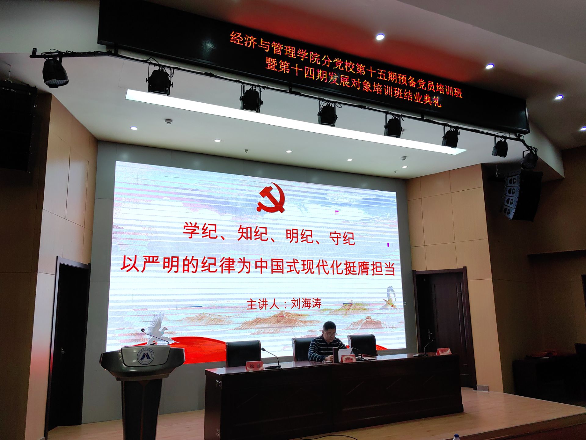 为深入学习贯彻习近平总书记关于党纪学习教育的重要讲话和重要指示精神,进一步强化学生纪律意识,推动党纪学习教育走深走实,5月15日,经济与管理学院党委副书记刘海涛以《学纪、知纪、明纪、守纪——以严明的纪律为中国式现代化挺膺担当》为主题,为学院分党校全体预备党员、发展对象讲专题党课。