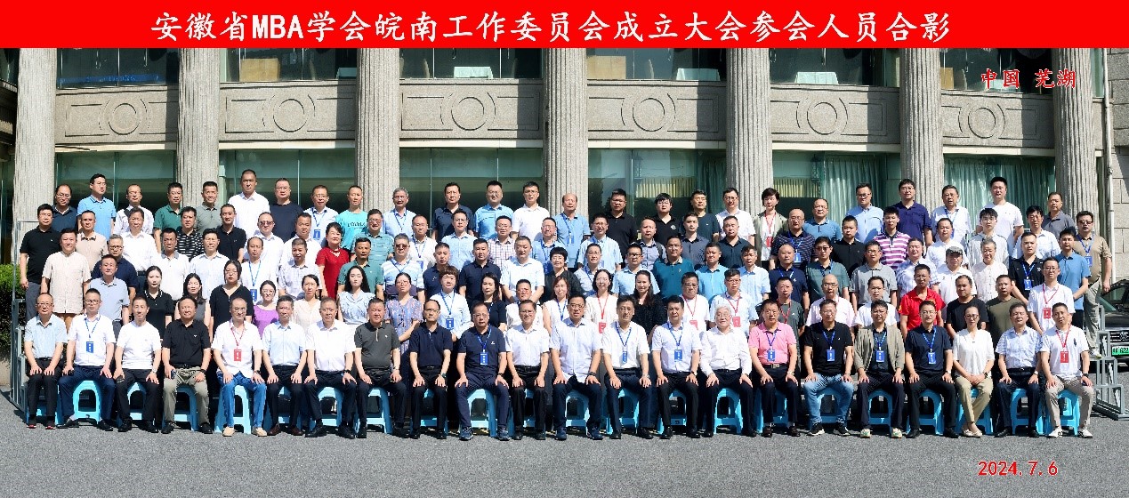 2024年7月6日安徽省MBA学会皖南工作委员会成立大会在芜湖海螺国际大酒店举行。安徽科技学院原校长、经管学院原院长李震,学院院长龚本刚、副院长蔡书凯和2023级全体MBA学生参加了成立大会。