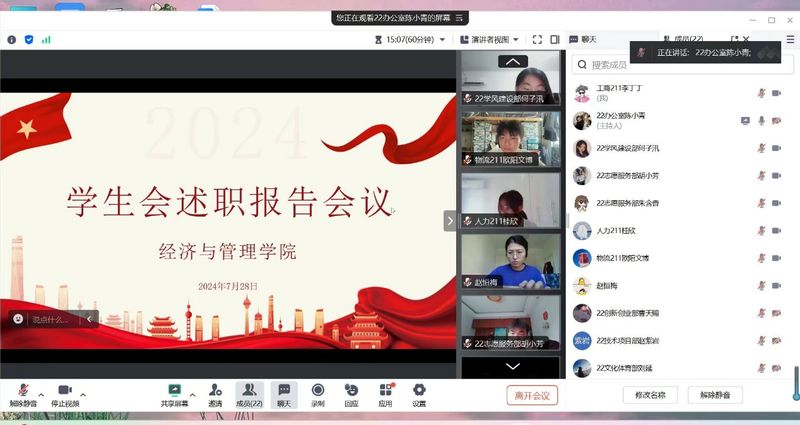 为进一步贯彻落实党中央和学校有关院学生会改革工作的重要要求,落实“三抓”工作部署,推动院学生会履行职责、发挥作用,切实加强学生会队伍建设和对学生会成员的监督和管理,全面准确地掌握学生会的工作情况,发现问题,提出改进措施,切实提升学生会的内部管理和服务质量。经济与管理学院于7月28日8:30举办线上学生会述职评议会议。学院团委书记赵恒梅、院学生会主席团成员、学生干部代表参加了本次会议。