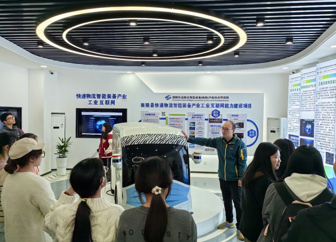 随后,同学们来到国邮研究院,作为国家邮政局设立的全国快递科技创新实验基地之一。在工作人员的带领和讲解下,同学们观看智慧物流动态演示沙盘、物流智能装备全景图谱,参观了行深智能AI泛运力载具智造车间、快递无人机、模块化AGV组合、高性能环保包装材料、智能扫描识别仪器等一系列前沿物流设备,以及智慧物流研究成果、产品及相关专利等。通过实地观摩和专业讲解,同学们了解无人物流配送车的配送全流程,深刻体会到物流装备技术的智能化发展方向,也激发了对物流技术创新的兴趣和热情。