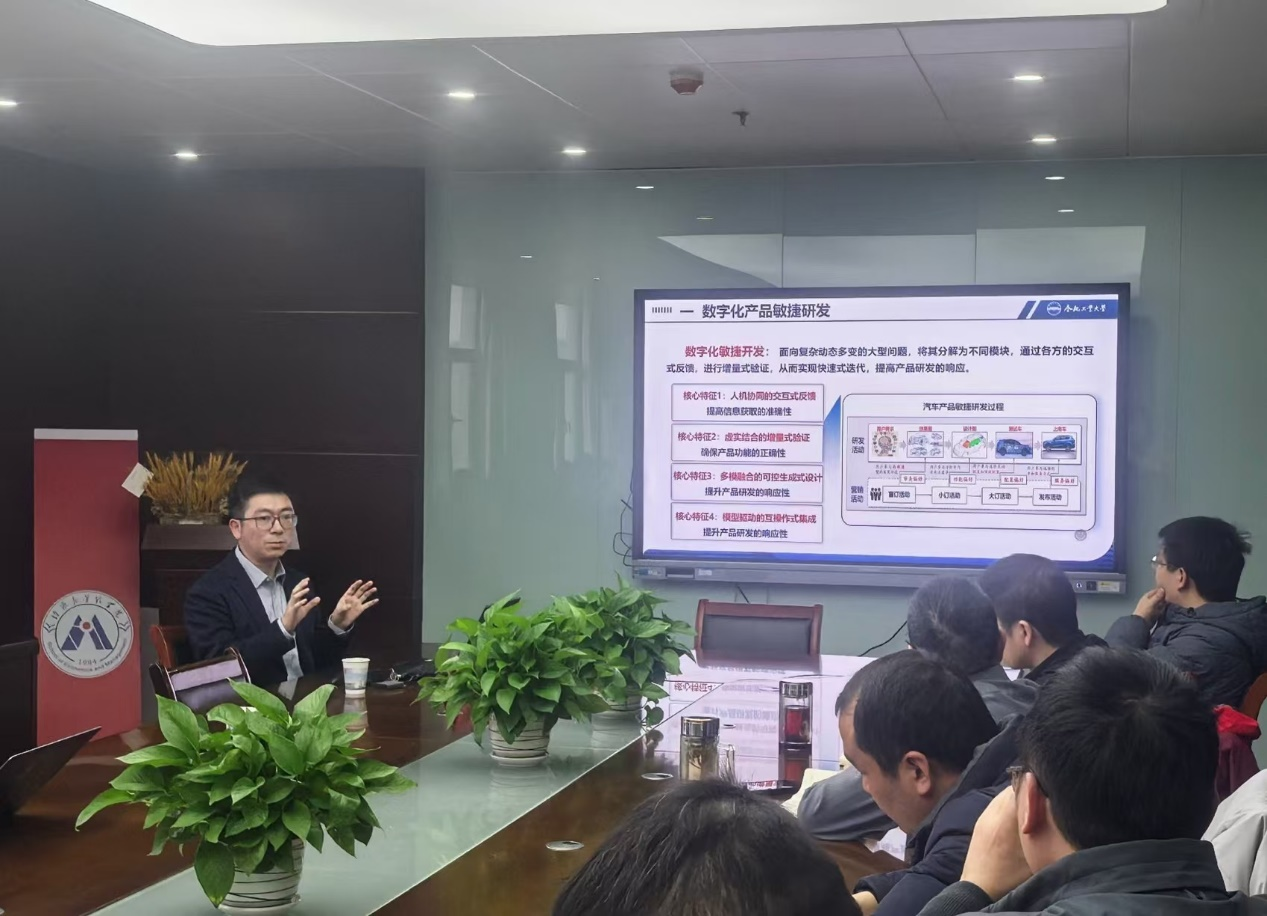 报告中,张强教授以传统汽车企业多产品战略研发战略在新情境下所面临的困境开篇,以亲身的校企合作项目研发实践经历,阐述了航空发动机等高端装备研发所面临的系统性挑战。通过对科技前沿的分析和世界一流企业的案例研究,强调了利用数字化技术构建敏捷研发体系的重要性,并提出了数字化敏捷开发所面临的核心特征。随后,张教授详细介绍了其团队在数字化敏捷研发上所做的工作,尤其是生成式AI技术在产品设计、仿真优化及决策支持等环节的具体技术和实践路径。张教授的报告问题鲜明、学术性强,体现了管理科学研究团队与制造企业协同合作,攻关“卡脖子”问题、贡献“管理力量”所取得的创新成果。报告会后,张强教授与我院师生就研究方向凝炼、基金选题、校企合作等开展了交流讨论,钟言久博士就自己的研究领域同在座师生进行了交流。