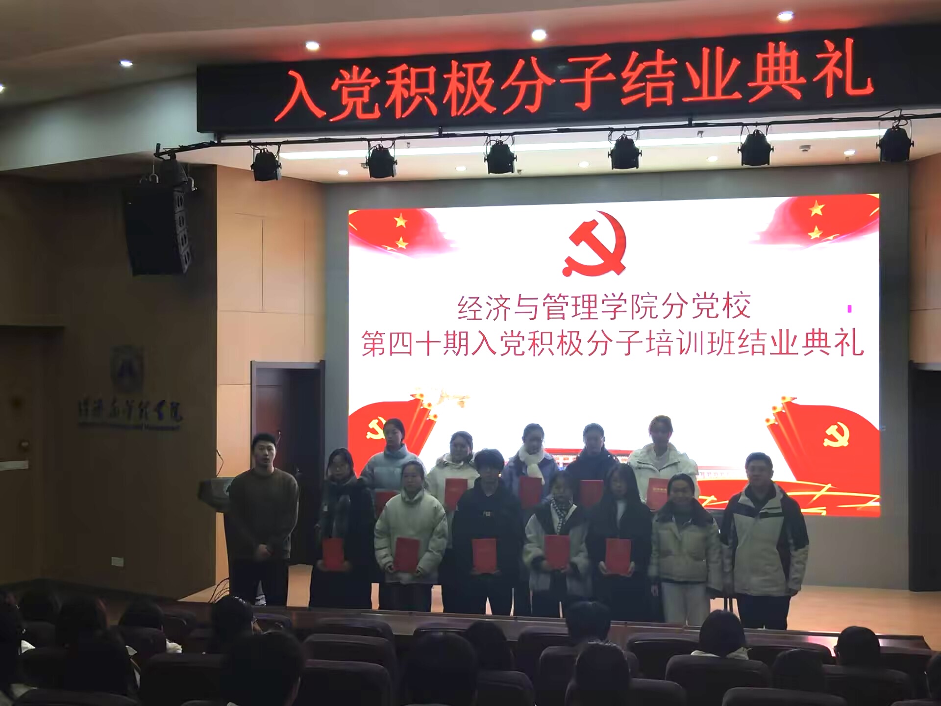 2024年12月12日,经济与管理学院分党校第四十期入党积极分子培训班结业典礼在C座七楼报告厅顺利举行,学院党委副书记刘海涛、培训班班主任高天宇、辅导员徐博及学院第四十期入党积极分子培训班全体学员共同参加。典礼由高天宇主持。