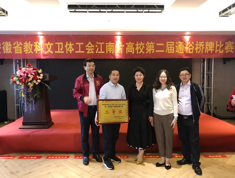 11月15日至17日,2019安徽省教科文卫体工会(江南片高校)第二届教职工通俗桥牌比赛在铜陵举行。我校由校工会主席王河带队参赛并荣获二等奖的好成绩。 比赛采用分两组循环比赛方式,根据每个参赛队积分平均成绩高低,决定比赛名次。为参加本次比赛,校工会遴选魏利胜、刘春红、陆华才、韩兵四名教工组建队伍,代表学校参加比赛。赛前队员们利用业余时间积极准备,比赛中配合默契,经过11轮分组循环比赛的激烈角逐,最终荣获二等奖。 通俗桥牌比赛既是智力竞技运动,也是社交性活动,通过本次比赛不仅提升了我校教职工的桥牌水平,丰富了教职工的精神文化生活,也加强了各高校间的交流和沟通。