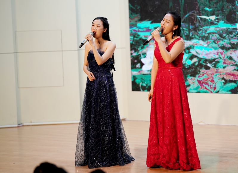 我校第一届教职工歌唱大赛冠军退休老师崔晓明,第一届十佳歌手黄蓉静、沈洋应邀助场献唱,用歌声向建校八十五周年献礼,现场的氛围热烈高涨。
