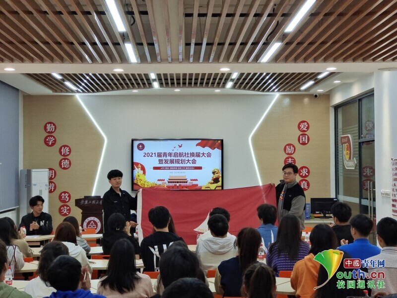 会上,离任社长王子航同学和新任社长王明海同学分别作了交流发言,结合自身学习工作经历分享了对社团工作的感想和收获,汇报了上一年度的工作学习总结,阐述了下一年度社团工作计划和主要安排,并希望和全体新成员共同学习和进步,积极组织思想交流和实践宣讲活动,团结和带领2021届青年启航社全体社员积极探索,学习新思想、新政策,营造积极向上的良好氛围,合力推进2021届青年启航社的全面发展。之后进行社旗交接仪式,社旗的传递象征着青年启航社的换新,新血液的注入必定会使启航社焕然一新。