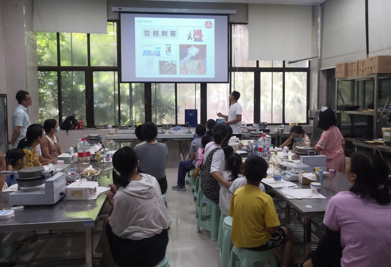 本次活动分为4个场次进行。食品工程系教师李玉锋老师分别从冰淇淋蛋筒制作和冰淇淋制作两个步骤详细地介绍了手工冰淇淋的制作工艺和细节,并且现场示范。制作过程中李玉锋邀请两个小朋友作为志愿者为大家搅拌冰淇淋粉,并设置“雪糕知识问题”互动。