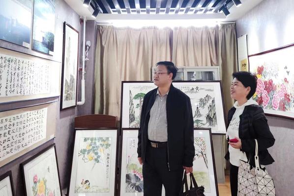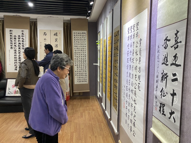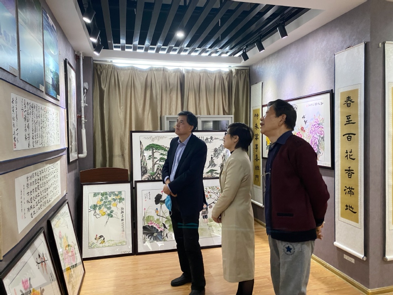 活动现场,领导和老师们饶有兴趣地参观欣赏,驻足其间。书画摄影作者纷纷向大家介绍自己书画摄影作品灵感来源及作品技巧。张志宏观看后频频点赞,他对离退休工作处在离退休教职工中开展的特色工作,取得的丰硕成果,做出的积极努力表示赞赏和肯定,他说老同志们通过书画摄影等艺术形式抒发自己对党和国家以及学校发展的关注和深厚情感,展示了我校离退休教职工永远跟党走、奋进新征程、喜迎二十大的良好精神风貌;他要求相关职能部门特别是离退休管理部门要多搭平台,开展形式多样的学习教育活动,不断丰富离退休教职工晚年业余文化生活,同时也要充分发挥老同志们的政治优势和经验优势,依托关心下一代工作平台在学校师德师风建设中发挥积极作用。苏国红看完作品后表示离退休老同志是学校建设发展的宝贵财富,他们昂扬的精神风貌和乐观的生活态度为广大教职工树立了榜样,在金秋岁月里展现艺术人生,她要求离退休工作处要继续创新工作和服务,积极收集校史资料,让老同志们在校史建设中发挥积极作用;叶常林对老师们的作品也高度赞扬,表示学校的建设发展就是一代代安工程人的接续奋斗和精神传承,老同志们用画笔和镜头书写初心,用热情和奉献助力学校不断前行。程双四认真欣赏了每幅作品,他说书画艺术不仅能陶冶情操,静心养性,而且对于净化校园文化环境,提高人文素养也有独特的作用,丰富的艺术作品展现了老同志们不忘初心,喜迎二十大的美好愿望。