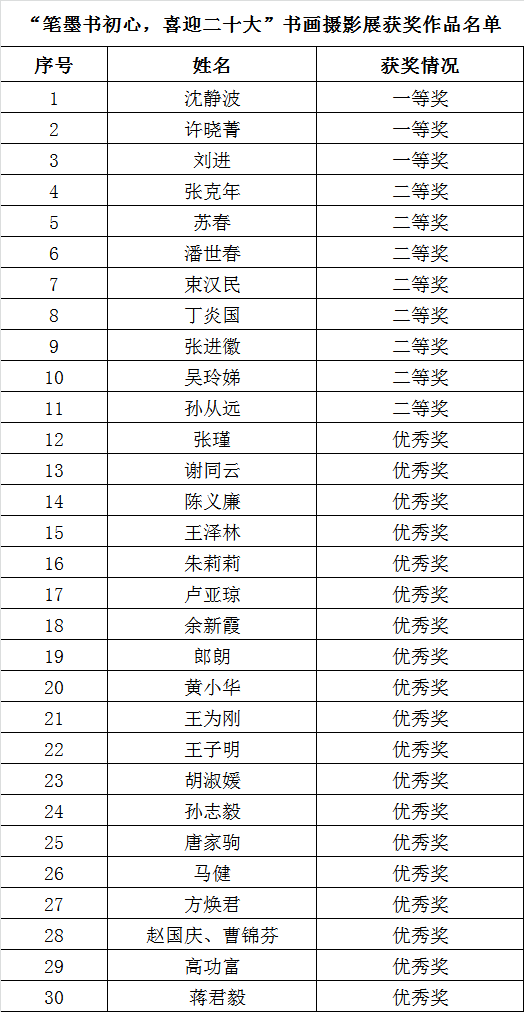 为深入学习贯彻习近平新时代中国特色社会主义思想,抒发广大离退休教职工爱党爱国、对党忠诚的革命情怀,充分展示我校离退休教职工永远跟党走、奋进新征程的精神风貌,离退休工作处(党委)于10月13日-11月13日举办了“笔墨书初心,喜迎二十大”书画摄影展。经过专家综合评审,评选出一等奖3名,二等奖8名,优秀奖19名,现将获奖作品名单予以公布。