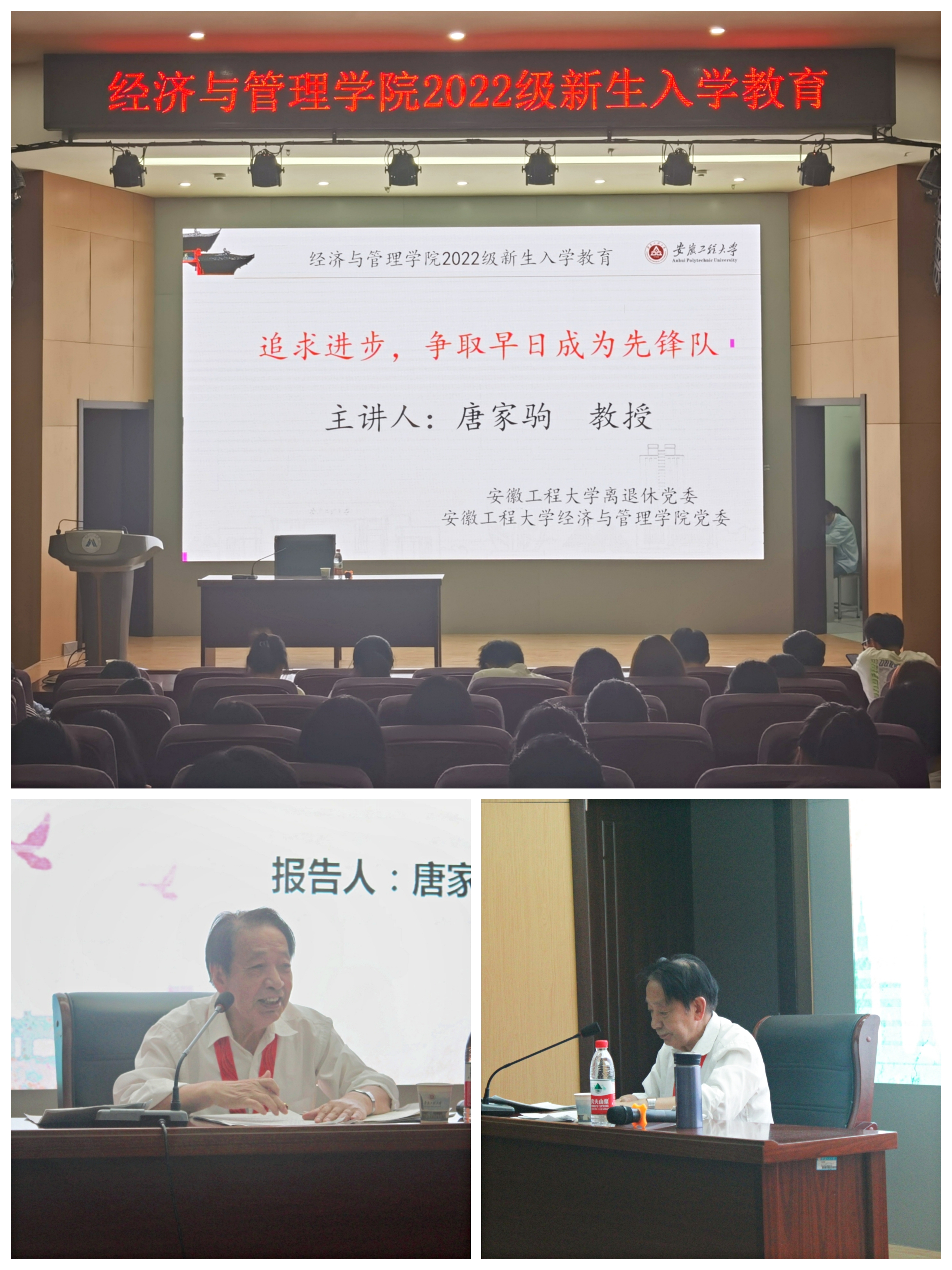 为帮助2022级新生正确规划大学生活,明确未来目标和发展方向。经济与管理学院于9月27日、30日,在C座七楼报告厅举办2022级新生入学教育,离退休党委老党员唐家驹教授为新生讲解题为“追求进步,争取早日成为先锋队”的专题思政课,离退休党委第二党支部陈晓红书记出席了活动。 唐家驹以在党57年老党员的身份向大家讲述了中国国情、党史和校史。唐家驹基于当今社会主要矛盾的变化分享了过去与现在的差距,中国各方面得到飞跃发展,人民正在一步步地迈向美好生活,这都得益于中国共产党的领导。唐家驹以毛泽东、周恩来、邓小平等伟人的事迹为例,鼓励广大青年同学向优秀共产党员学习。 唐家驹带领同学们重温了习近平总书记对新时代青年的要求,激励新生同学们树立远大理想,拥有远大抱负;坚守马克思主义信仰,坚定中国特色社会主义理念;做时代先锋,勇立时代潮头;要不断为实现中华民族伟大复兴梦而努力;坚定“四个自信”,德智体美劳全面发展;树立奉献、创新意识。要用青春的能力和创造力激荡起民族复兴的澎湃力量,用青春的智慧和汗水拼搏出一个更加美好的中国。 唐家驹教授今年已85岁高龄,有着丰富的工作经历和成就,为高等教学事业做出了有力贡献。唐家驹教授以高水平要求自身,以党的纪律规范自身,充分展现了老党员的风范。对于同学们该如何追求进步, 唐家驹教授表示:广大青年要及时提交入党申请书,积极学习党务知识;学好科学文化知识;积极发展自身,争做优秀学生;遵守学校各项规章制度;时刻反省自己,纠正自身;身心健康,劳逸结合。作为经济与管理学院退休的老教师,唐家驹教授亲切寄语青年学子:伟大时代降大任,经管学子用真心,明确时代新要求,早日成为先锋队! 本次思政课赢得新生们的热烈掌声,激励大学新生勇于探索前进方向,奋发向前,追求进步,争取早日成为先锋队。