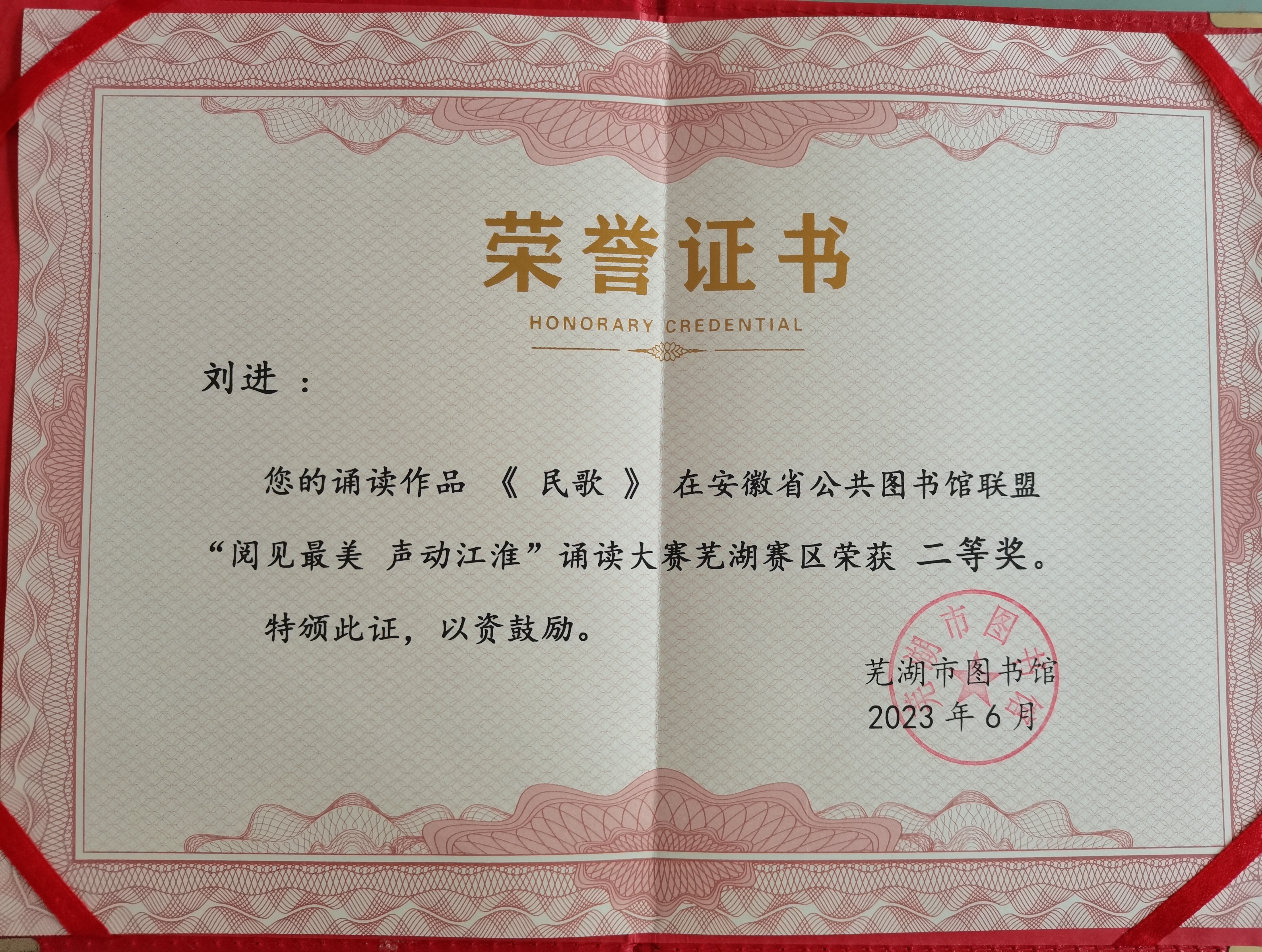 近日,由安徽省公共图书馆联盟主办,各联盟成员馆承办的“阅见最美 声动江淮”诵读大赛芜湖赛区获奖名单揭晓,我校退休教师刘进老师诵读的作品《民歌》在比赛中荣获二等奖。