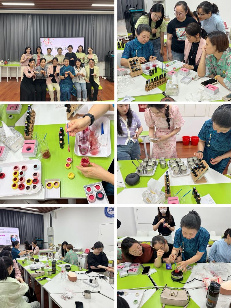 邬红芳教授指导大家古法口脂的DIY手工制作,老师们亲自体验各种天然原材料的组合配方,按照传统方法和步骤来制作,一个个古法口脂应运而生。从颜色选择到模具定型,制作过程中大家感受到手工的魅力,在紧张的工作之余舒缓压力、陶冶情操。