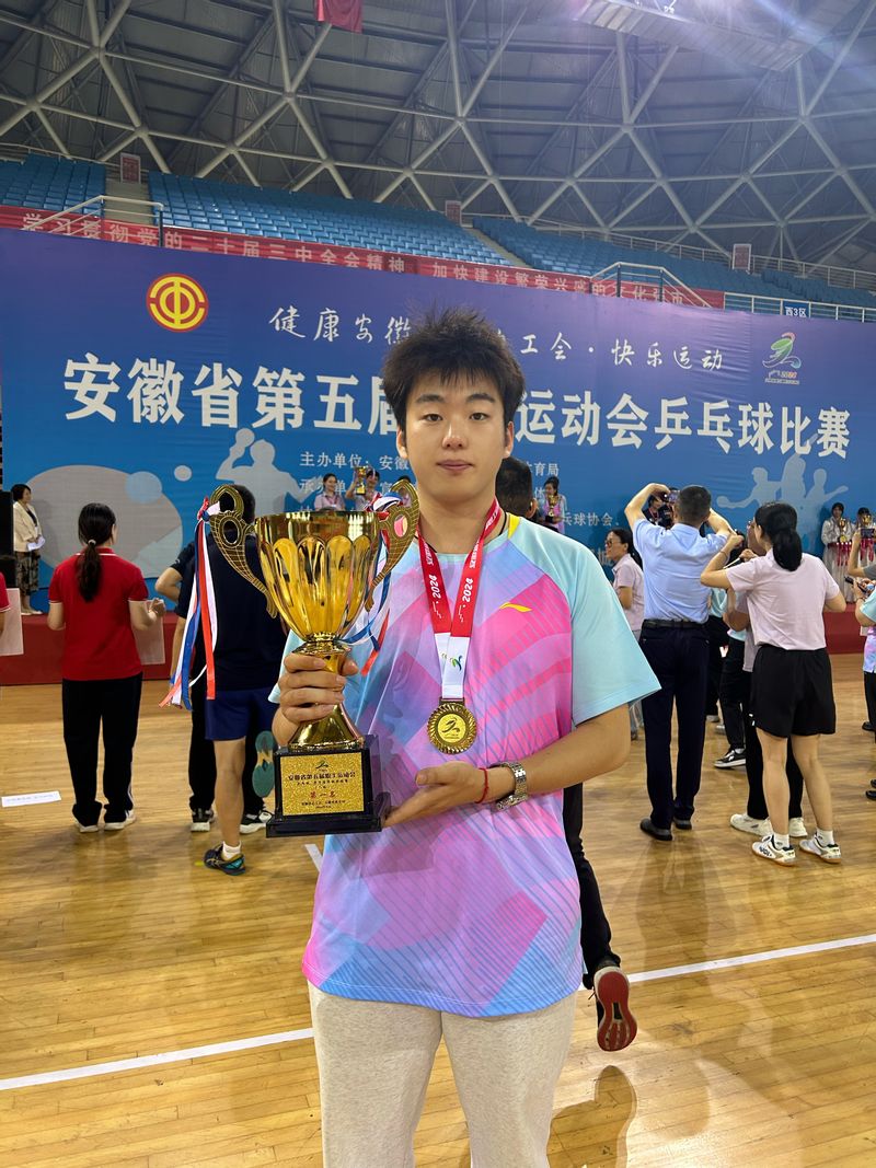 9月19至22日,安徽省第五届职工运动会乒乓球比赛在宣城市体育中心举行。我校体育学院教师朱祥瑞代表省教科文卫体工会代表队参赛,最终荣获乙组青年男子团体赛冠军和青年男子组个人第六名的好成绩。