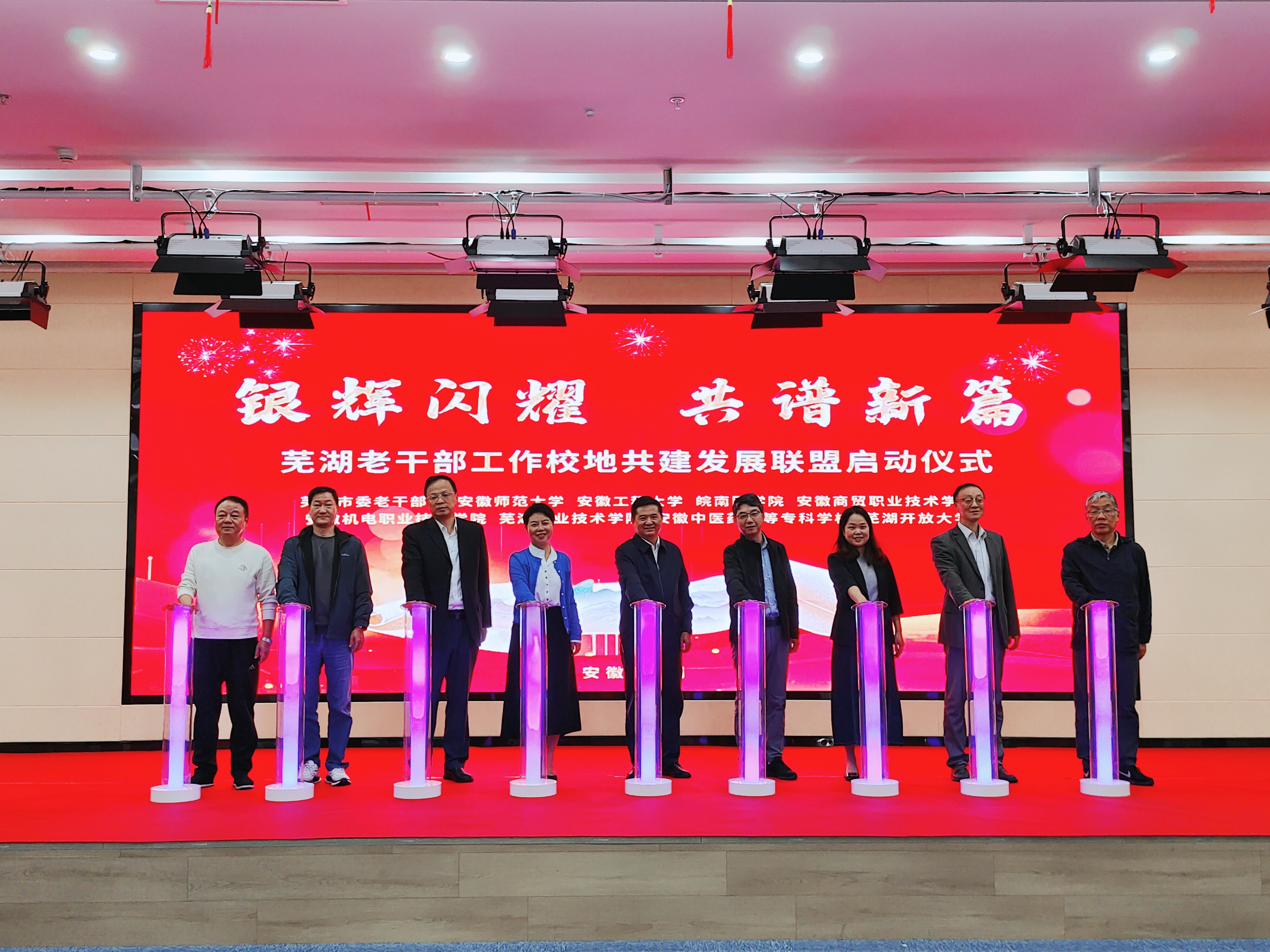 启动仪式上,市委老干部局与安徽师范大学、RayBetApp官网下载 、皖南医学院等8所在芜高校代表,共同点亮象征着芜湖老干部工作校地共建发展联盟成立的灯柱,拉开了芜湖老干部工作校地共建发展的帷幕。