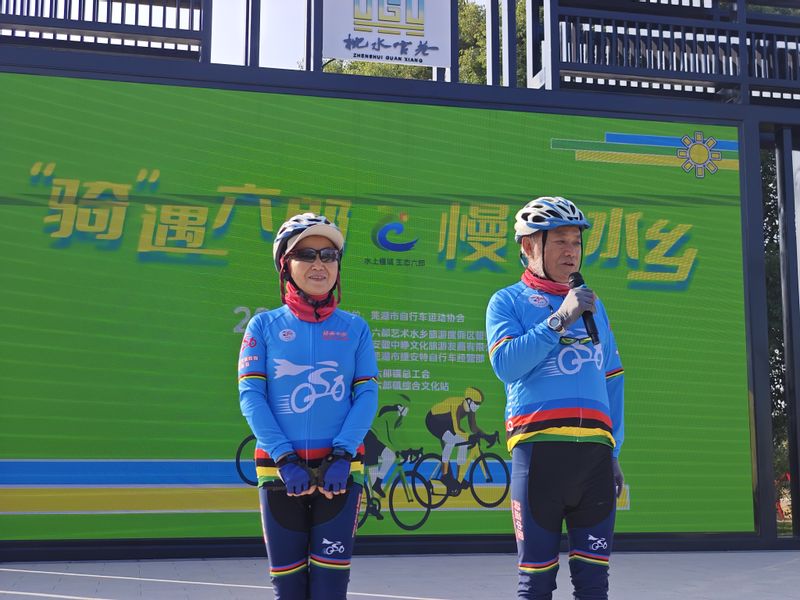 为支持我校与湾沚区六郎镇政府 “大学小镇”共建项目建设,我校红色骑行思政工作室入驻小陶村,助力六郎镇官巷村和小陶村红色骑行驿站和展馆建设,积极发挥红色骑行在和美乡村建设中的作用。 11月2日,六郎镇举办了“骑遇六郎 慢行水乡”骑行活动,我校红色骑行思政工作室负责人赵国庆、曹锦芬受邀参加活动并开展专题宣讲,作为助力六郎镇官巷村和小陶村红色骑行驿站和展馆建设的重要活动。六郎镇党委委员、宣传委员曹娟,芜湖市自行车运动协会秘书长陈勇、六郎镇全域旅游运营单位中峥文旅总经理汪静以及来自芜湖市的近100名骑行爱好者参加此次活动。