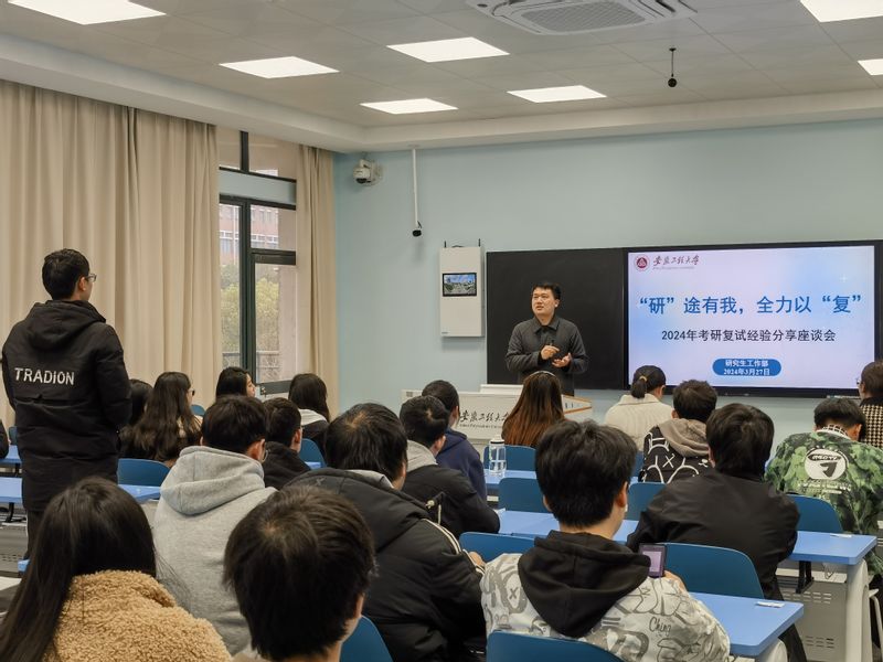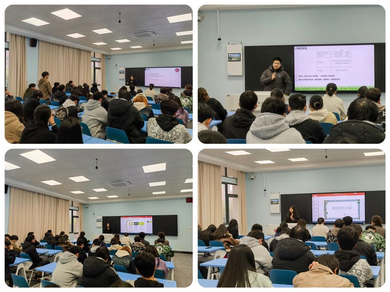 会上,来自经济与管理学院的段敬文围绕复试的基本流程,强调了科研成果与英语口语表达能力的重要性。电气工程学院的淤立伟结合自身经历,从复试笔试、面试的自我介绍、夯实基础知识以及积极关注导师动态等方面讲述了复试过程的注意事项。设计学院的鉏梦月介绍了有效储备专业知识的方法并鼓励同学们在复试中要始终保持自信。化学与环境工程学院的陈丽敏重点阐释了面试的注意事项,并就面试仪表、中英文自我介绍、专业知识问答等方面分享自己的备考经验。