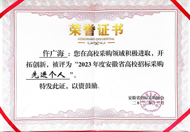 近日,安徽省招标采购协会高校采购专业委员会第五次会议暨2023年度安徽省高校采购论坛在合肥召开。本次论坛以“优化招采营商环境,助力教育强省建设”为主题,会上宣布了2023年度评优评先结果并进行了颁奖仪式。我校荣获“2023年度安徽省高校招标采购先进集体”荣誉称号,仵广海老师荣获“2023年度安徽省高校招标采购先进个人”。会上,各高校参会代表还围绕“高校科研仪器设备采购需求管理的难点与解决思路”、“教育信息化管理平台采购实际探索”等方面进行了专题研讨。