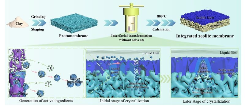 该团队以廉价粘土为原料构筑出原膜(protomembrane),实现无溶剂体系下“内部生长”分子筛膜,并提出界面转化机理。粘土作为载体原料的同时,为分子筛膜生长提供“营养”,使分子筛晶体根植于载体中,与载体形成异质结结构,实现载体与膜层的一体化,从而增强膜材料的机械强度和稳定性。所制备的分子筛膜对二甲苯/邻二甲苯(p-X/o-X)分离因子高达6263,渗透通量达到1.21x10-7 mol·m-2s-1·Pa-1。该工作将为同类膜材料的制备提供新思路,促进膜分离技术的发展。