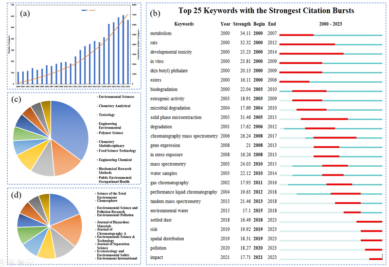 2000-2023年论文、研究领域和出版物期刊发展趋势。年度和累积论文数量(a),突发关键词分析(b),十大最热的研究领域(按Web of Science分类)(c)和十大发表最多的期刊(d)