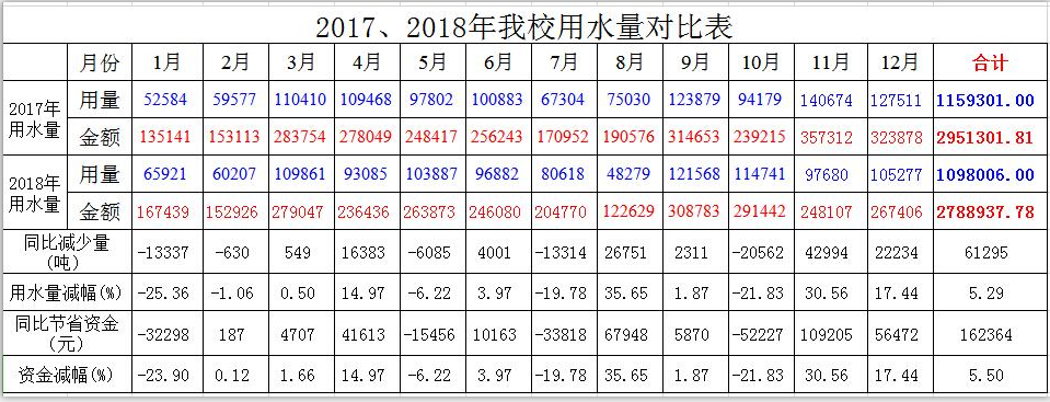 近期,总务处完成年度用水数据分析,同比2017年,我校2018年节水工作成效显著,总用水量减幅5.29%,节省资金16.2万元。