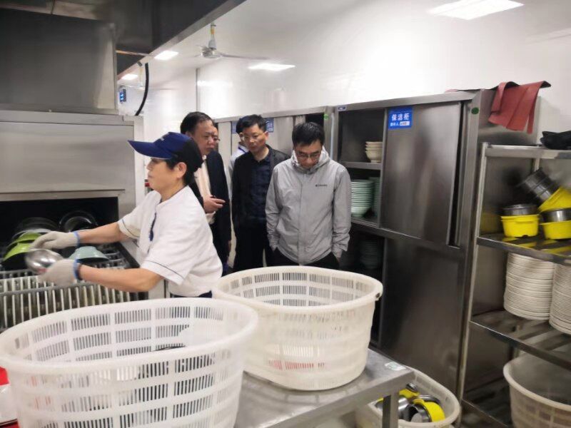 郑健首先到食堂后场对原材料仓库、冷库、荤素菜加工间、餐具清洗消毒和食品留样情况进了检查,查看了相关工作台账和记录,他强调食品安全是餐饮工作的生命线,事关广大师生健康,事关学校教学、科研等正常工作秩序稳定,要求食堂严格按照餐饮食品安全操作规范操作,增强安全意识,做到警钟常鸣。