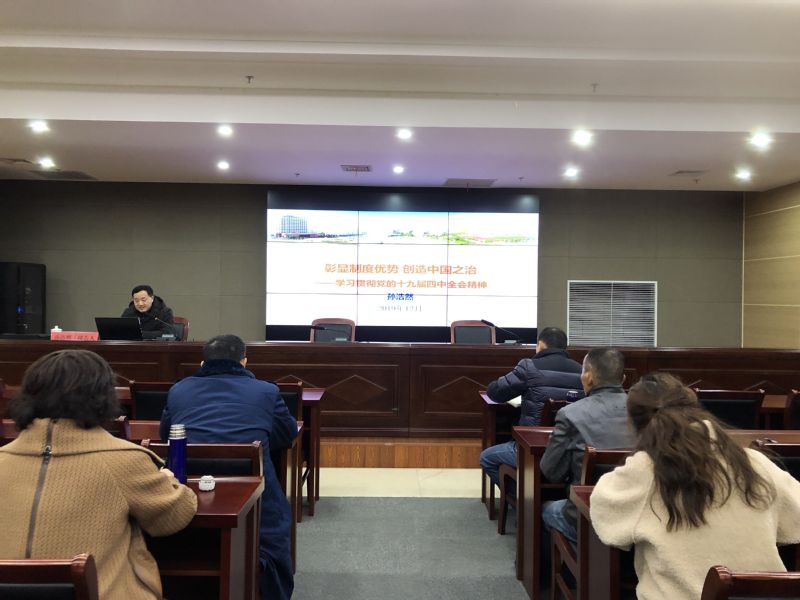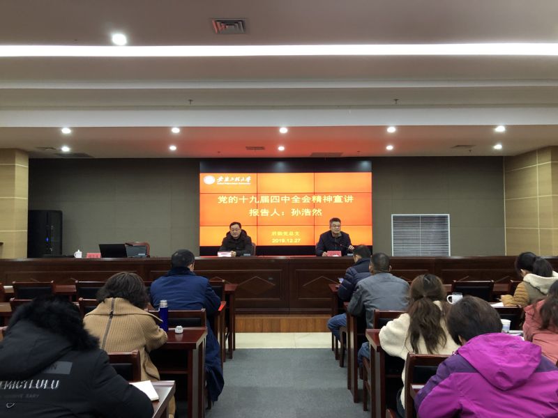 为深入学习贯彻十九届四中全会精神,根据校党委的统一安排,12月27日下午14:30,校十九届四中全会精神宣讲团副团长、校党委常委、宣传部部长孙浩然在图书馆202会议室,为后勤保障处全体教职员工开展了学习贯彻党的十九届四中全会精神宣讲会,会议由后勤党总支书记纪天新主持。