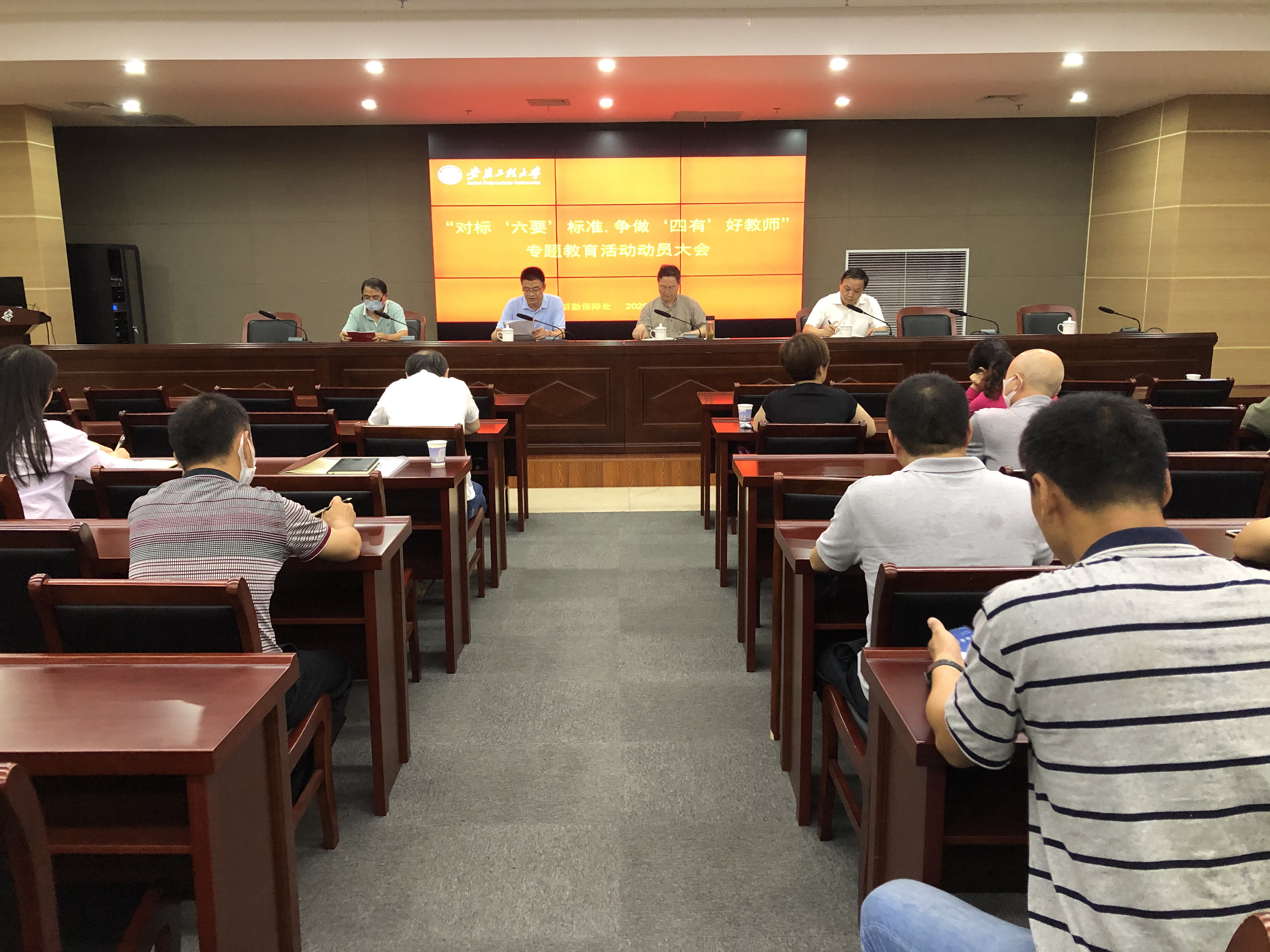 会上,纪天新传达了学校《“对标‘六要’标准,争做‘四有’好教师”专题教育活动方案》具体内容,随后由卢学根领学《新时代高校教师职业行为十项准则》和《教育部关于建立健全高校师德建设长效机制的意见》(教师〔2014〕10号)。
