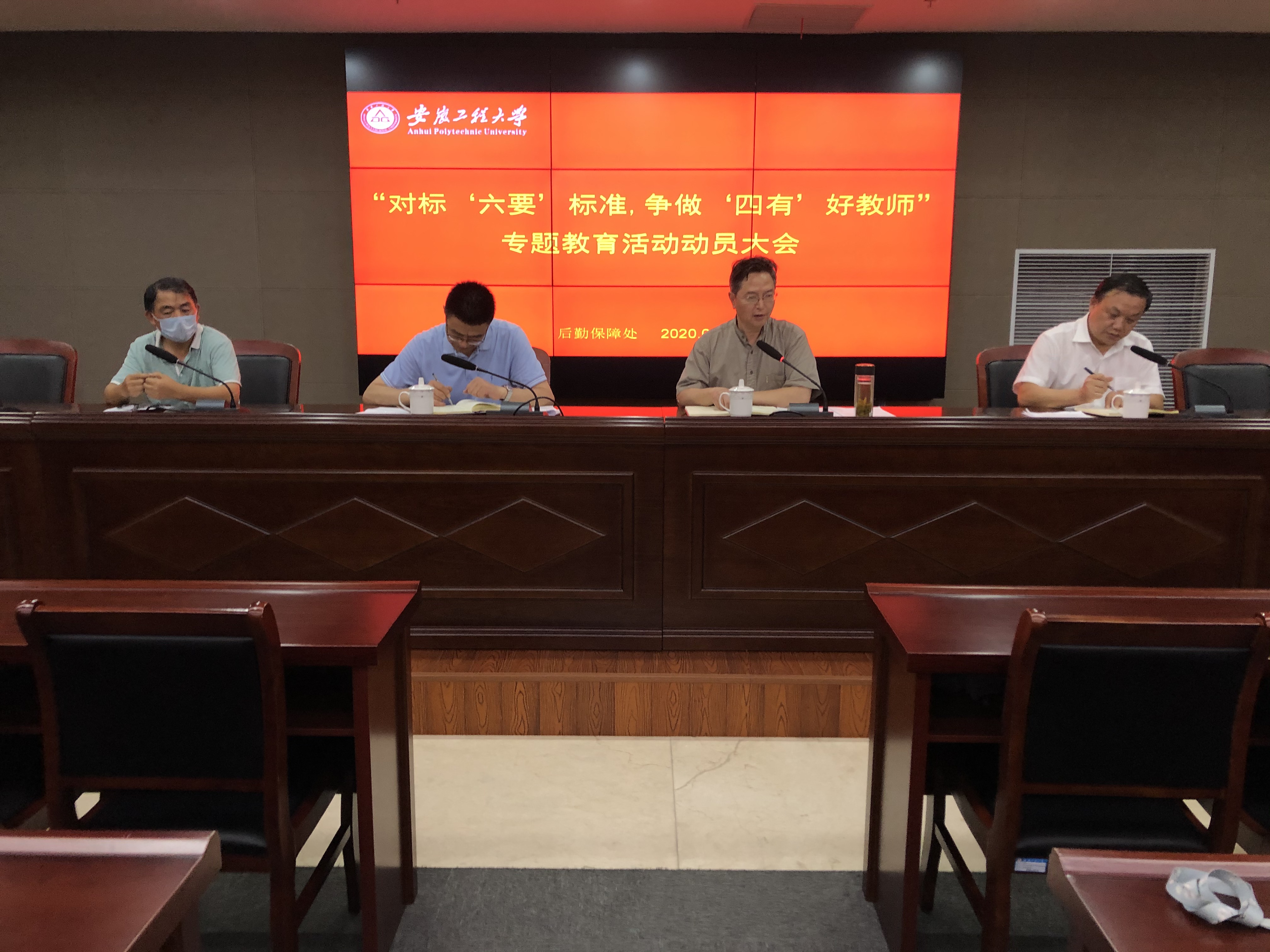 7月6日下午,后勤保障处在图书馆202会议室召开“对标‘六要’标准,争做‘四有’好教师”专题教育活动动员大会,校党委常委、副校长郭兴众到会指导,后勤保障处全体在编人员参加会议。会议由后勤党总支书记纪天新主持。