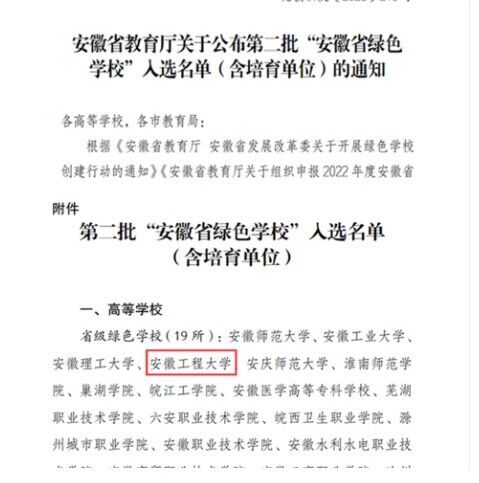 绿色发展理念再巩固,绿色学校建设更显著。学校深入贯彻落实习近平生态文明思想,厚植绿色发展理念,加强顶层设计,细化绿色学校创建任务,构建绿色学校创建管理体制。将生态文明理念全方位融入到后勤管理、教育教学等各个领域,在生态文明教育、节能改造与节能降耗、绿色创新技术研究等方面不断取得良好成效。2023年学校入选“安徽省绿色学校”,学校节能创建工作荣获2021至2022年度国家级公共机构能源资源节约典型示范案例,是安徽省高校唯一获评单位。