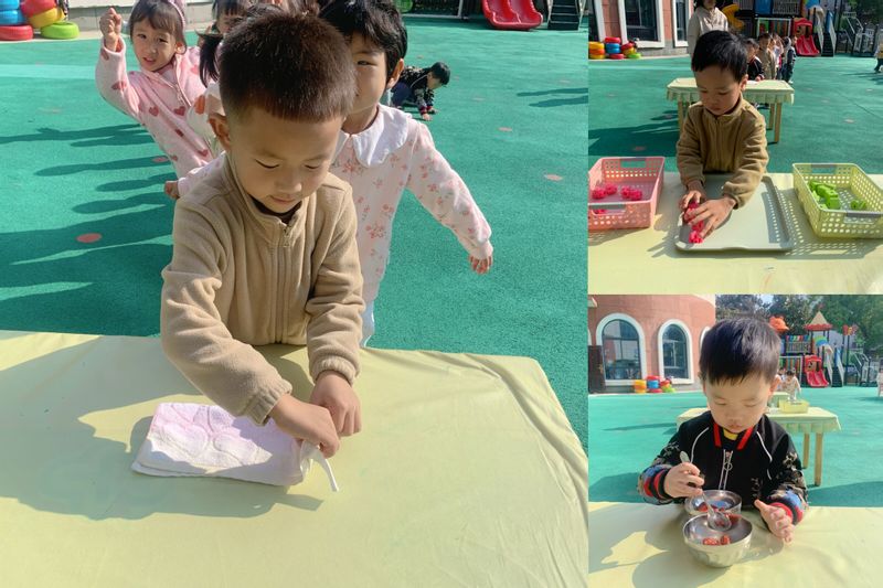 小班孩子们灵巧地叠放毛巾、整理玩具,小手舀红枣的动作虽显稚嫩却充满童趣。