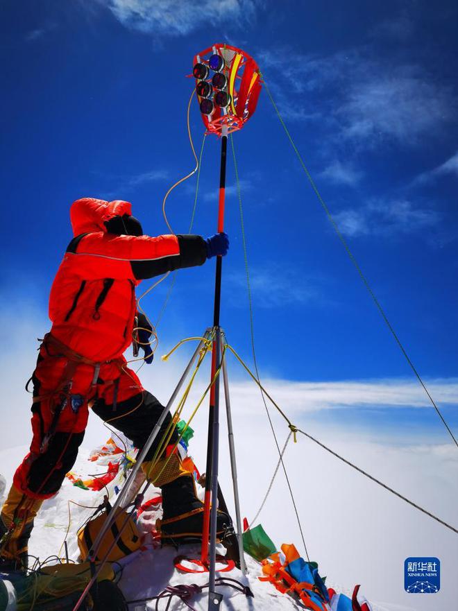 2020珠峰高程测量登山队队员在珠穆朗玛峰峰顶开展测量工作(2020年5月27日摄) 新华社特约记者 扎西次仁 摄 5G信号如何抵达世界之巅? 2020年4月,从海拔5200米的珠峰大本营出发,40名铺设组成员肩扛传输光缆,带着46头牦牛组成的运输队,在冰川山路跋涉,运送近8吨的建设物资,完成特种传输光缆铺设。 海拔6500米——4月30日下午,世界海拔最高的5G基站投入使用。加上此前在海拔5300米、5800米建成的基站,5G信号已实现对珠峰北坡登山路线及峰顶的覆盖。