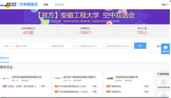 2月份以来,在学校的重视下,就业创业指导中心积极应对,先后启动四个空中双选会平台,实行学校网上审核信息,用人单位网上发布信息、招聘宣讲,毕业生网上投递简历,网上面试。供需双方达成协议,可以网络签约。截止当前,学校通过校企合作,对接空中招聘平台,共引入1139家企业在线开展招聘活动。其中,安徽省工科(芜湖)网络招聘会共计284家单位、新安人才网空中双选会共计321家单位,智联招聘空中双选会共计403家单位,易校招空中双选会共计131家单位。同时,对接各地人才,及时通过就业网发布了安徽工会、芜湖人才、合肥人才、常州人才、江阴人才、嘉兴人才、杭州人才、南京人才、苏州人才等就业招聘网的需求信息。