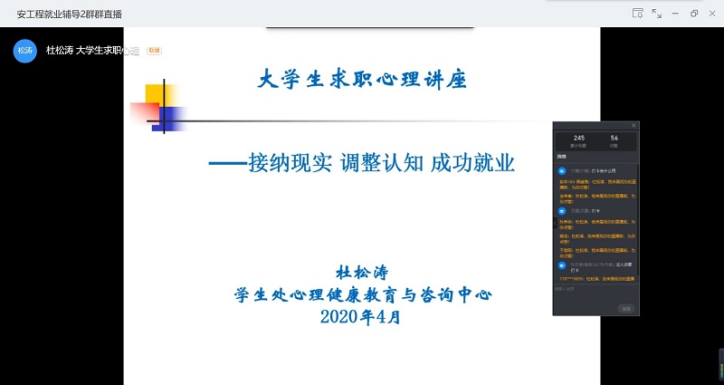 此次讲座根据毕业生求职中的诉求,结合当前就业形势,从求职应聘技巧、就业安全与风险防范、就业创业流程等方向设计了求职礼仪、求职心理、求职风险、视频面试、创业教育、创业项目培育和就业流程7个系列讲座内容,分别由学校长期从事就业创业一线工作的老师担任主讲。活动前期,辅导员利用QQ、微信、钉钉、学习通、腾讯课堂等线上工具,通过发布讲座海报、活动链接等方式,把讲座活动通知到2020届毕业班每一位同学,同时也吸引了非毕业班同学的积极参与,提前了解就业创业相关知识。活动中,老师们用系统的理论、生动的案例、风趣的语言,把毕业生在求职创业过程中个人能力的展示方式、需要注意的要点以及可能面对的困难进行深刻剖析,学生围绕知识点通过线上弹幕与主讲教师进行现场交流互动,在一问一答中加深了学习印象,在共同努力中展现了讲座效果。