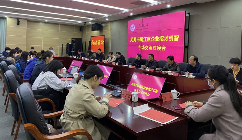 4月7日上午8:30,芜湖市鸠江区招才引智交流对接会在学校图书馆201会议室举行。校党委常委、副校长郑健出席会议并致辞。鸠江区委常委、宣传部部长魏超、区人社局局长肖宗明、区人才交流中心主任朱华朝及辖区12家重点企业代表参会。我校大学生就业创业指导中心、机械工程学院、电气工程学院、计算机与信息学院及材料科学与工程学院相关负责人及60名学生代表参与对接。会议由大学生就业创业指导中心副主任胡家增主持。