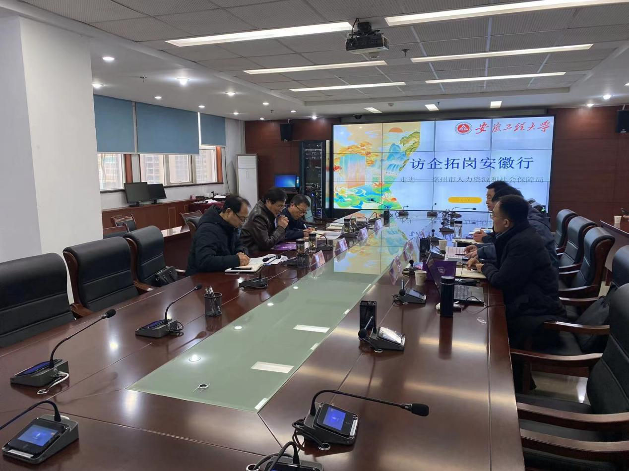 在座谈交流中,亳州市人力资源社会保障局党组成员、副局长孙亚伟、宿州市埇桥区人社局党组成员杨瑞芳等分别介绍了各自市情、区情和人才政策,并对我校的来访表示热烈欢迎,郭全根在讲话中对人社部门的热情接待表示感谢,他介绍了学校的基本情况、人才培养以及2024届毕业生基本情况,迟传德、王彦青分别就各自学院的专业特色和学生的就业去向做了介绍。